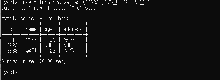 insert into 테이블명 values (칼럼1값, 칼럼2값,..);으로 입력하는 것도 가능하다.