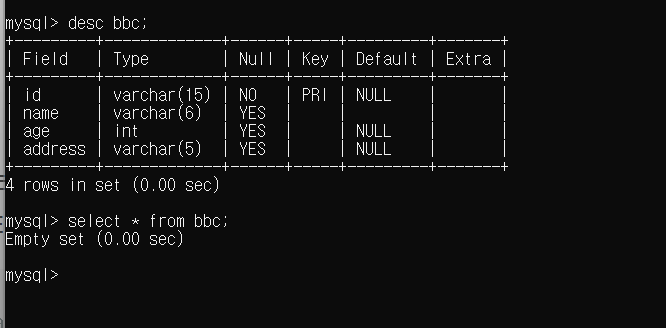 필드의 구성을 확인하기 위한 방법은 일반적으로 select *(모든것) form 테이블명;으로 확인할 수 있으며