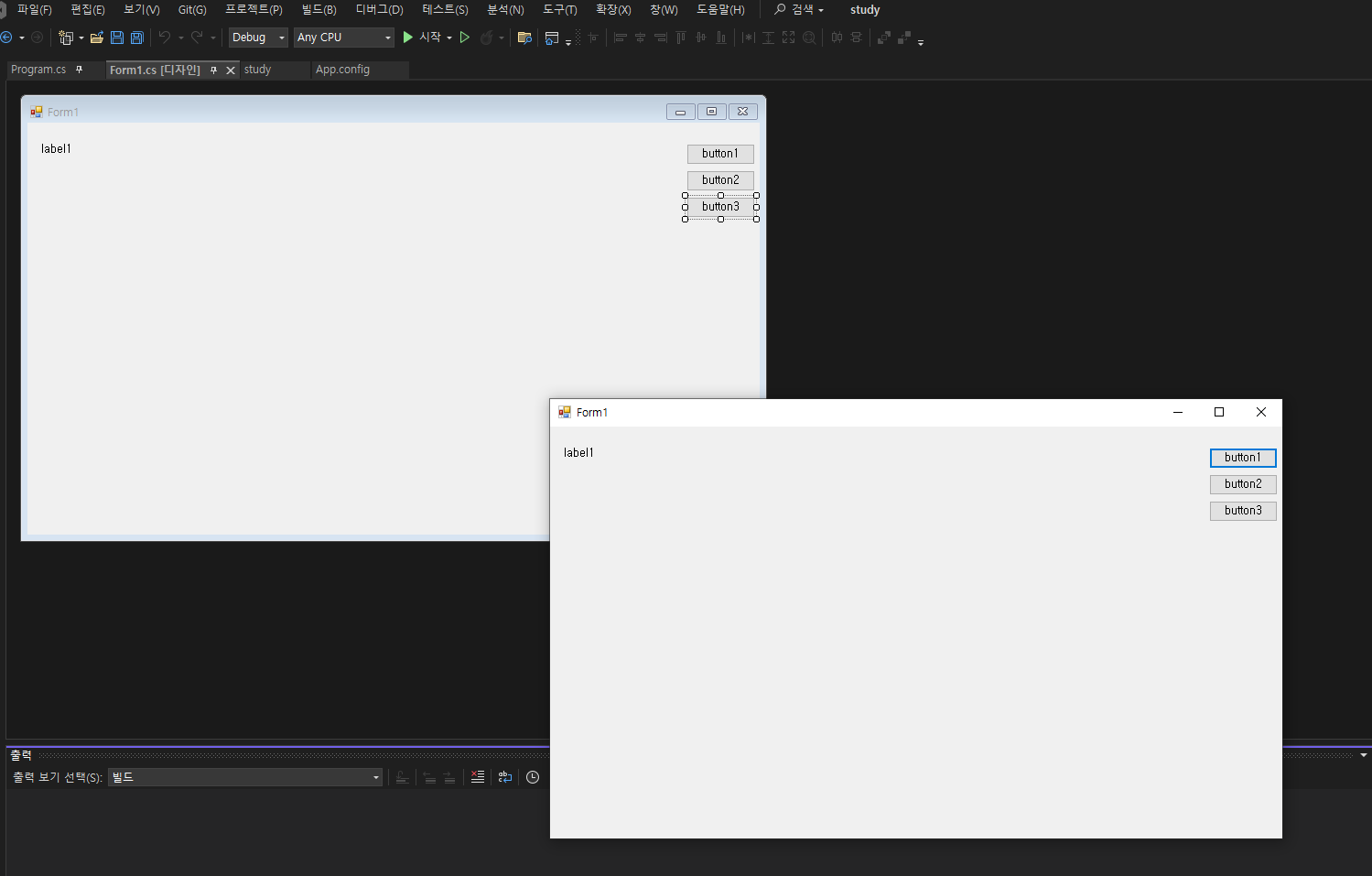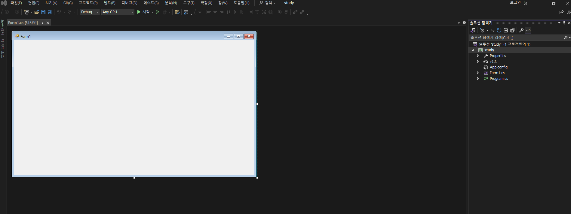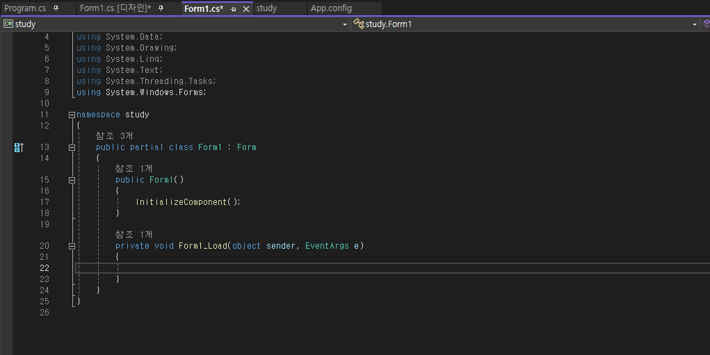 Form1에 코드를 작성하고 싶다면 캔버스 아무곳에서 더블클릭을 하면 됩니다.