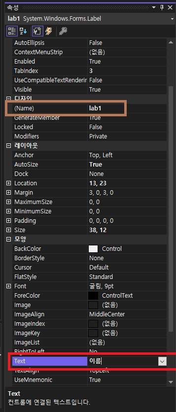 lbl1.Text = "변경된 이름"; //name.속성 = 값