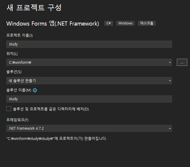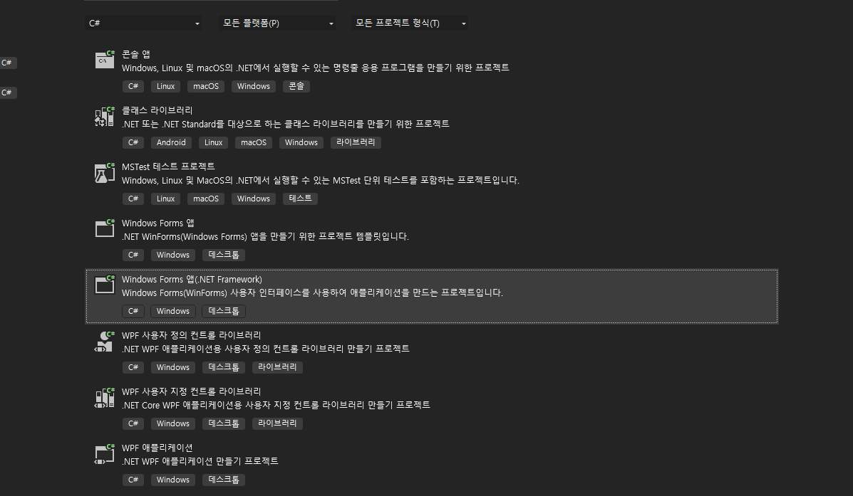 window Forms 앱(.NET Framework)를 클릭하고 다음버튼을 클릭합니다.