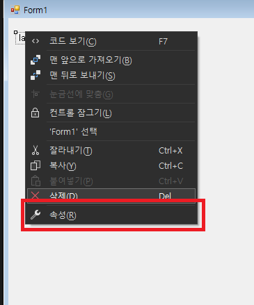 먼저 label1을 오른쪽 클릭 후 속성을 클릭합니다.