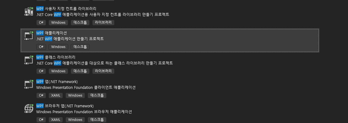 WPF 앱(.NET Framework)가 아닌 WPF 애플리케이션을 선택하고 프로젝트를 생성합니다.