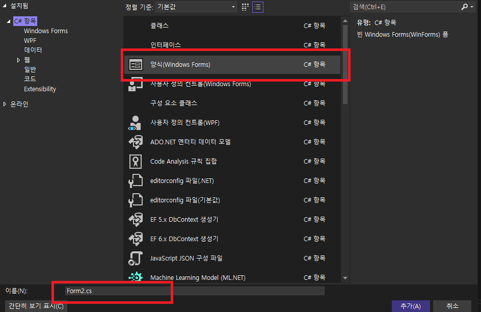 아래 그림에서 네모박스 Windows Forms를 클릭하고 이름을 입력하고 추가 버튼을 클릭하면 됩니다.
