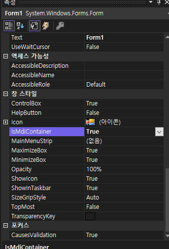 먼저 부모가 되는 Form1 속성에서 IsMdiContainer를 True로 변경합니다.