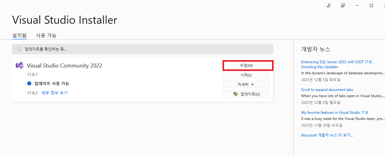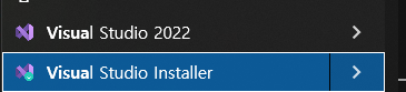 시작에서 Visual Studio Installer를 찾아서 클릭합니다. 못 찾으면 찾기에서 검색하셔도 됩니다.
