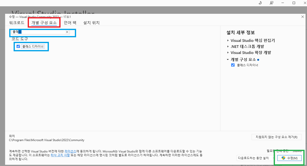개별구성요소 탭을 클릭한 후 클래스 디자이너를 찾아 선택한 후 수정버튼을 클릭합니다.