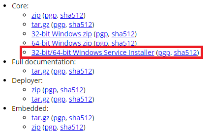 좌측 메뉴 > Download 메뉴 > Tomcat 9 버전 클릭 > Core > 32-bit/64-bit Windows Service Installer > 클릭해서 다운로드합니다.