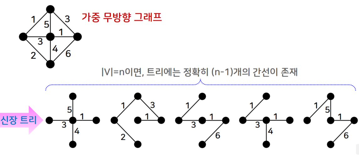 신장트리란 가중 무방향 그래프에서 모든 정점을 포함하는 트리를 의미합니다.
