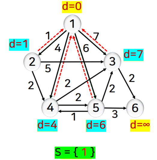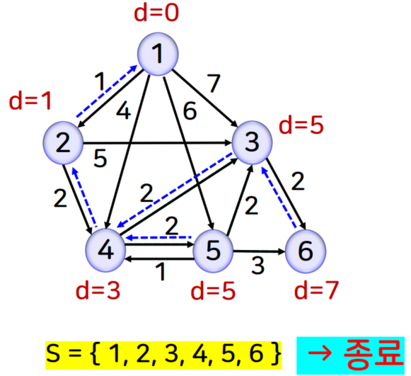 출발점 1에서 이동가능한 정점의 거리가 간선의 값으로 변경됩니다.