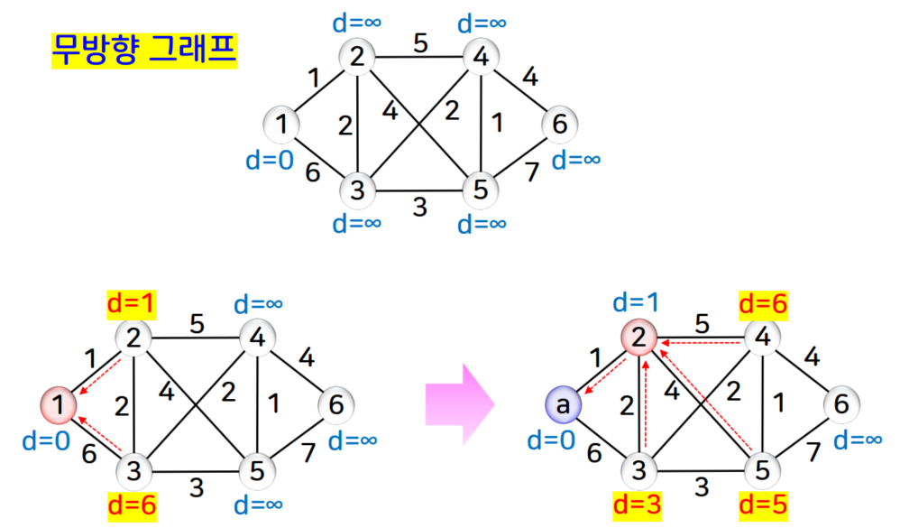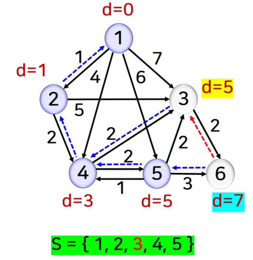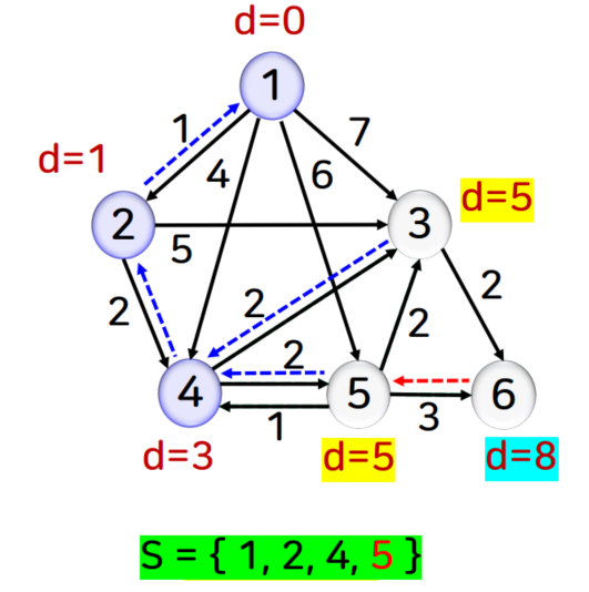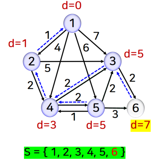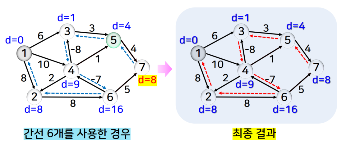 d[6]=1-2-4-5-6 = 1+2+2+3 = 8이 되고 d[3] = 1+2+2+2 = 7이 되는데 기존 거리인 d[3] = 5이므로 거리가 변하지 않습니다.