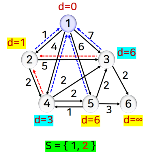 거리 가장 가까운 2가 두번째로 선택되며 2의 인접한 정점은 3,4가 있습니다. 이 때 1에서 바로 3으로 가는 것보다 1에서 2를 거쳐서 3으로 가게되면 1+5가 되어 d[3] = 6이 됩니다. 그리고 1에서 2를 거쳐 4로 가게되면 1+2 = 3이 되므로 d[4] = 3으로 바뀌게 됩니다.