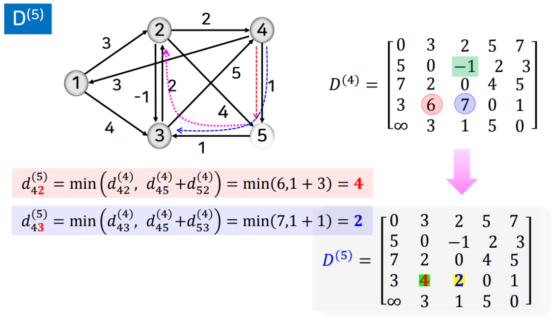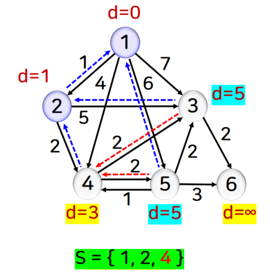 2에서 거리값이 가장 가까운 것은 4가 되며 4에서 인접한 정점 중 3,5가 있습니다.