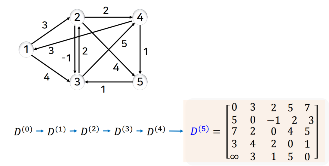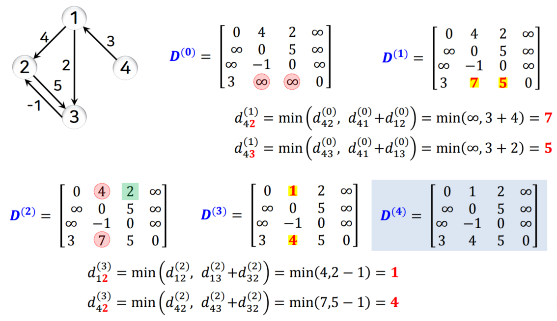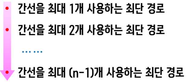 G = (V,E)에서 |V| = n일 때 단계적으로 최단경로를 구해나갑니다.