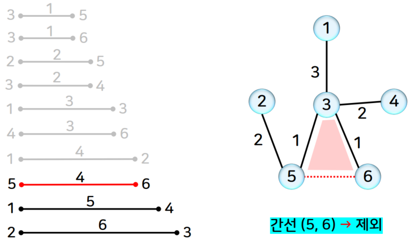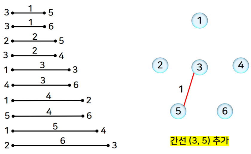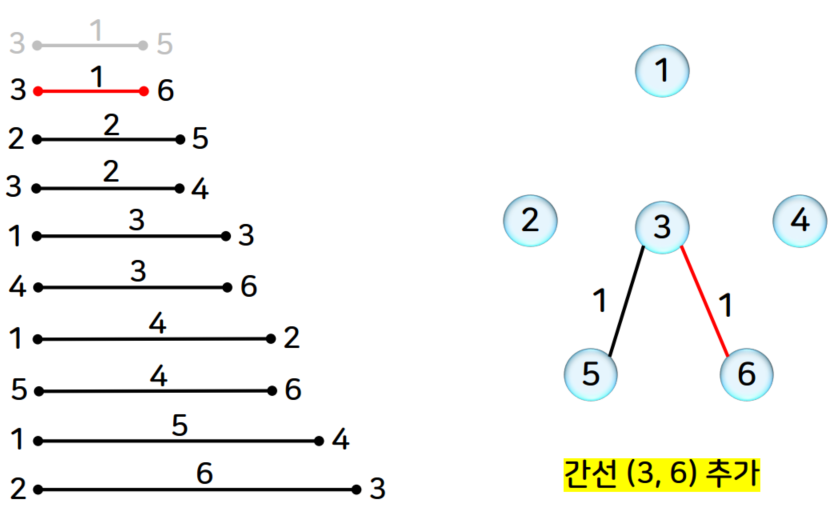 정점 1,3의 간선 중 선택되지 않은 간선 중 가장 가중치가 낮은 것은 3-5 또는 3-6입니다. 순서는 둘 중 하나로 해도 상관없습니다. 여기서는 정점 5를 먼저 선택했습니다.