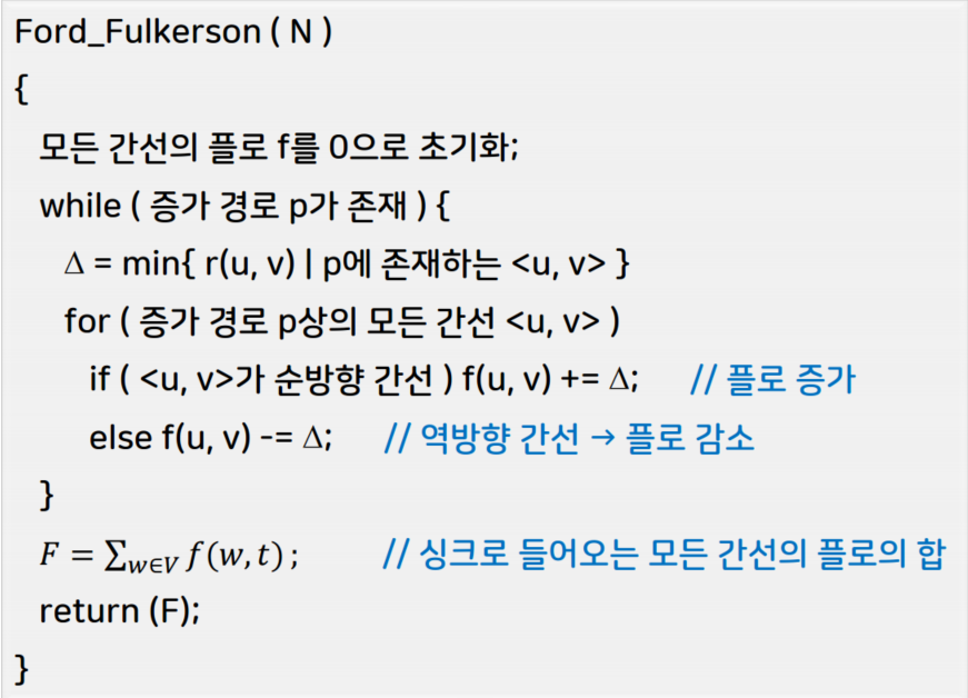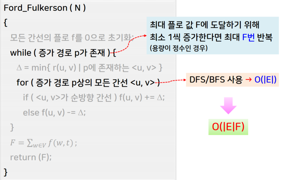 단순히 플로 값을 증가시킬 수 있는 모든 경우의 수를 탐색해서 적용합니다. 단점으로는 종료가 보장되지 않아서 추후에 에드몬즈-카프 알고리즘으로 발전합니다.