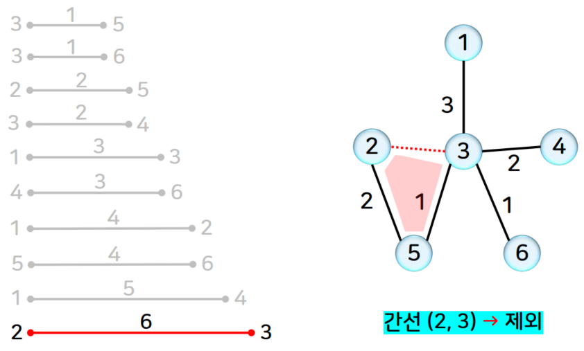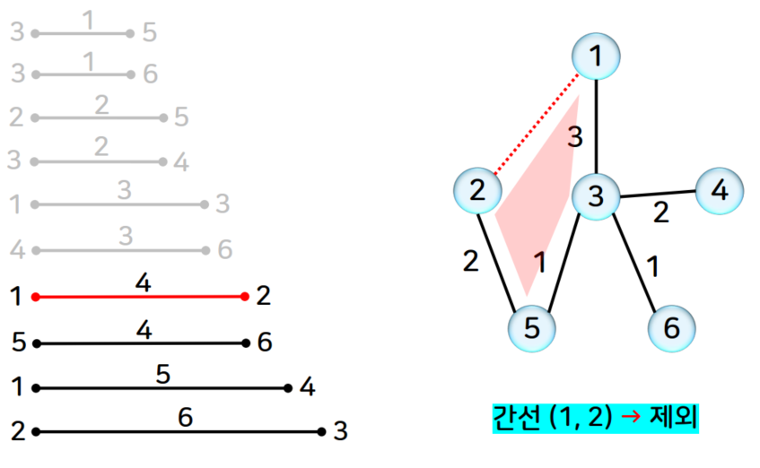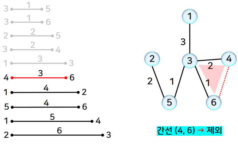 for ( 가중치가 가장 작은 간선부터 모든 간선 (u, v) ∈ E에 대해서 ) //O(|E|)