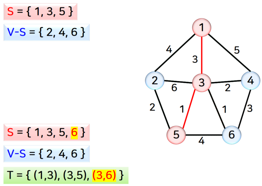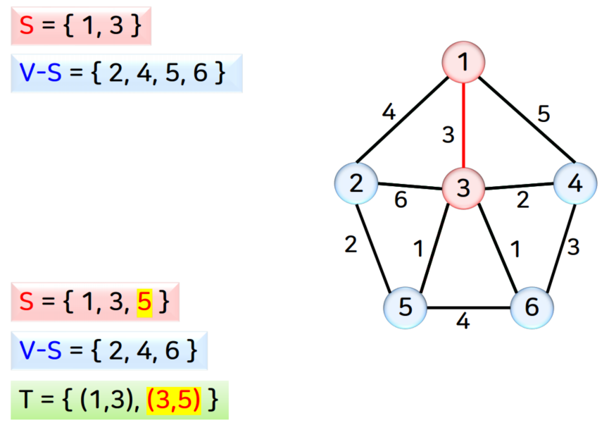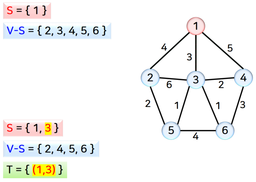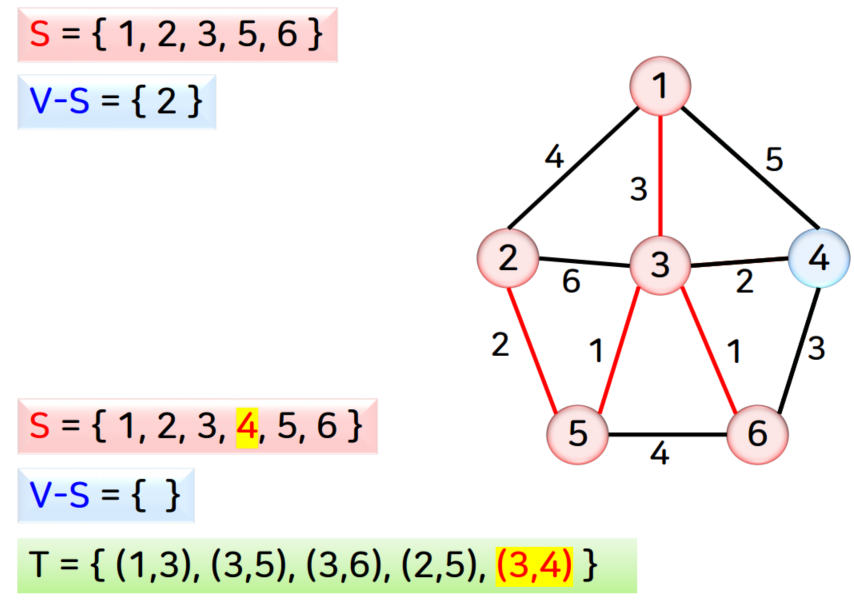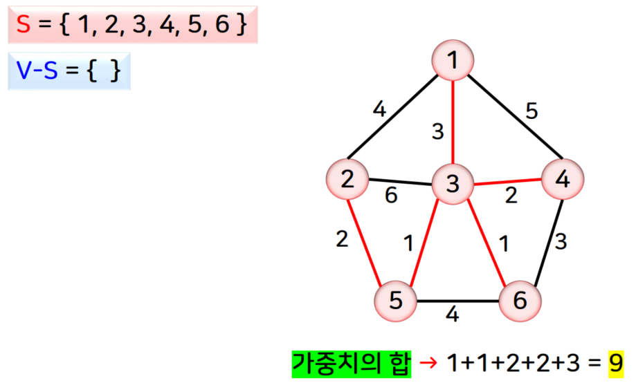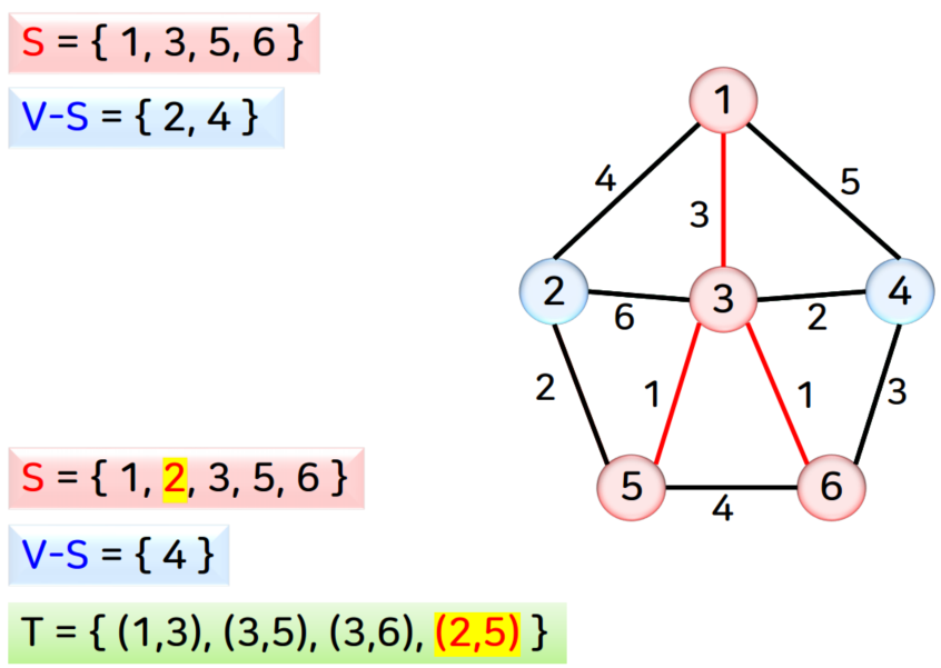 즉 임의의 정점 하나를 S로 지정한 후 시작해서 S=V가 될때까지 S를 점점 키워 나가는 방법입니다.