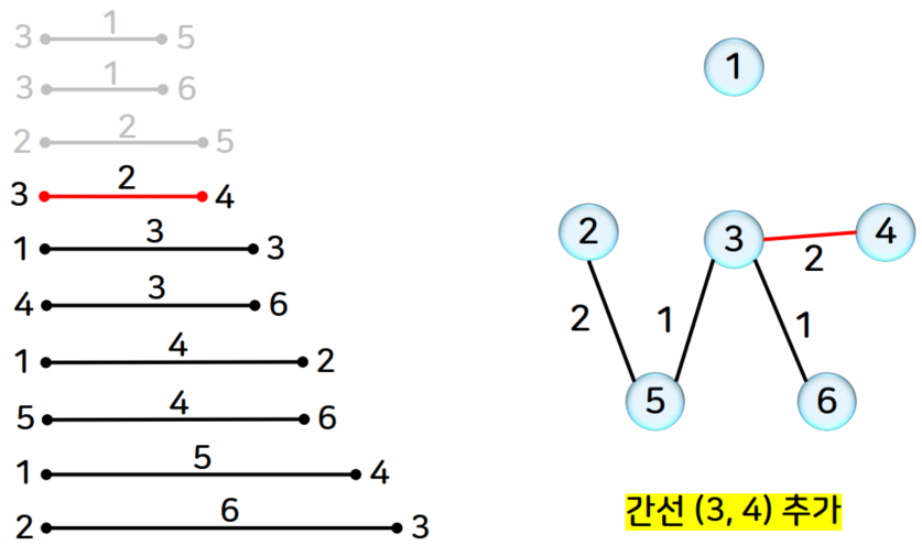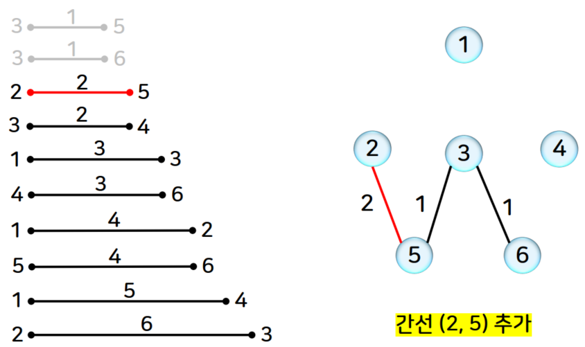 정점 1,3,5,6의 간선 중 선택되지 않은 간선에서 가중치가 가장 낮은 것은 2-5, 3-4입니다. 따라서 둘 중 아무거나 선택해도 되지만 여기서는 정점 2를 선택했습니다.