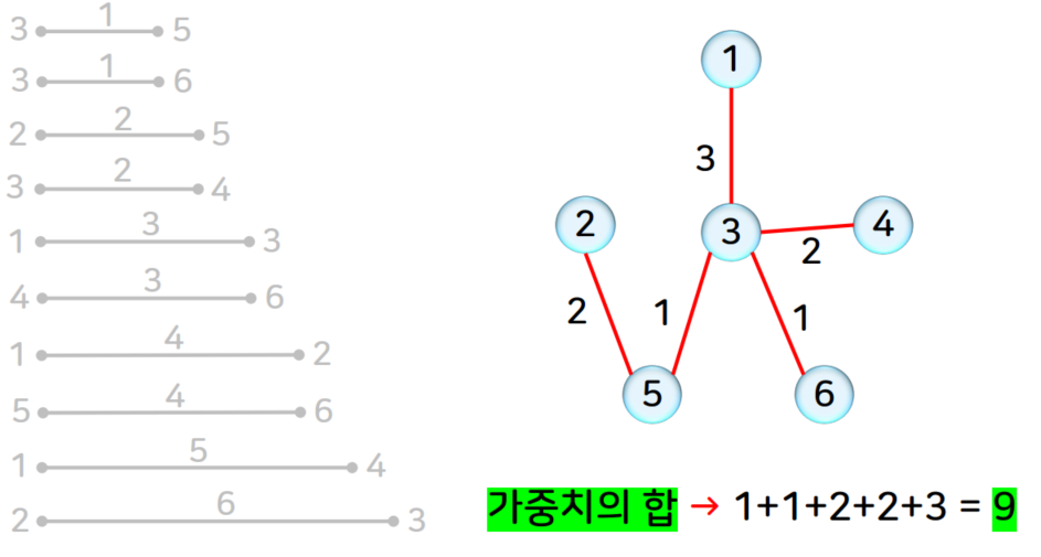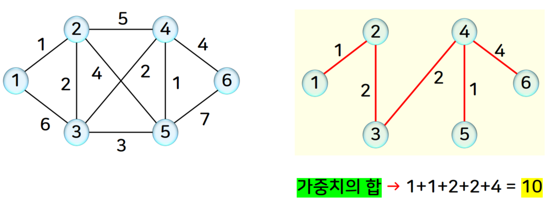 모든 간선 중에서 정점을 모두 연결하면서 가중치의 합을 가장 작게 만드는 (n-1)개의 간선을 고르는 과정이라고 할 수 있습니다.