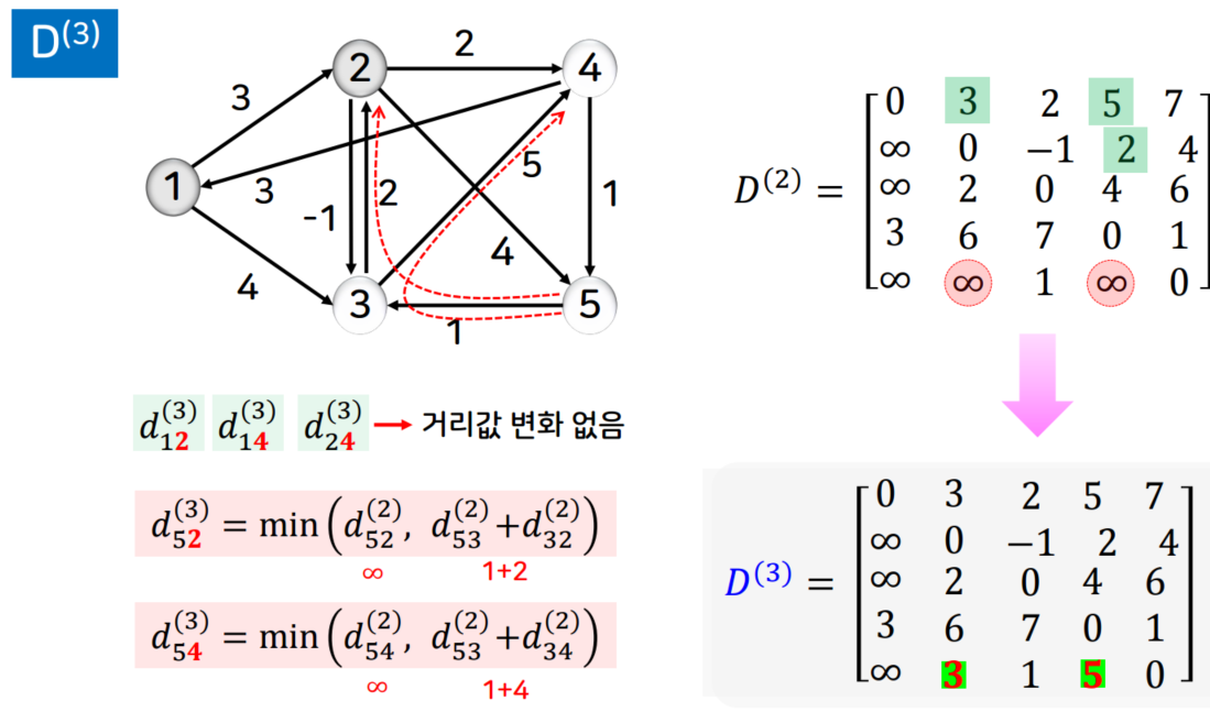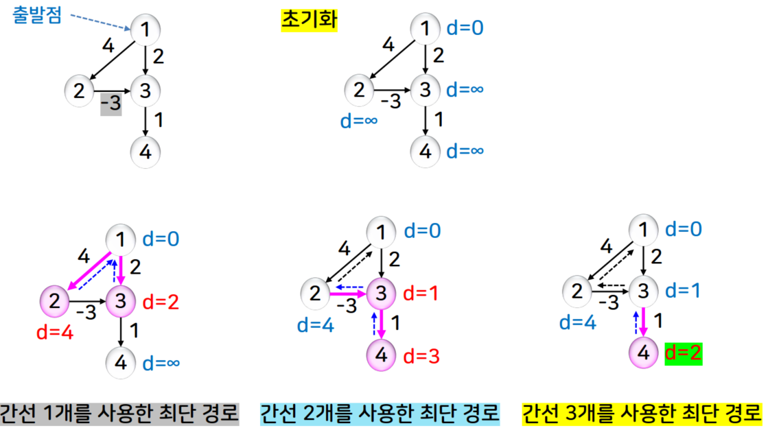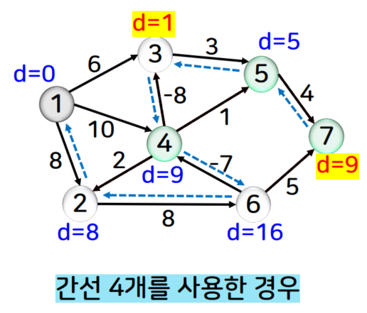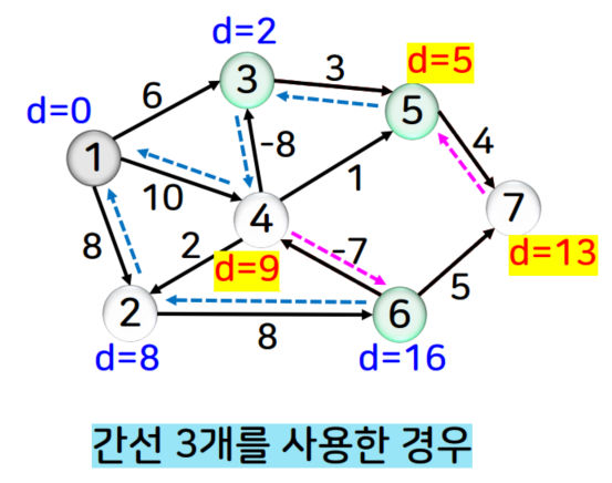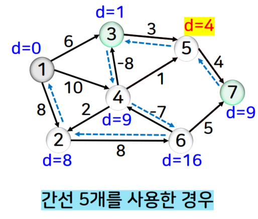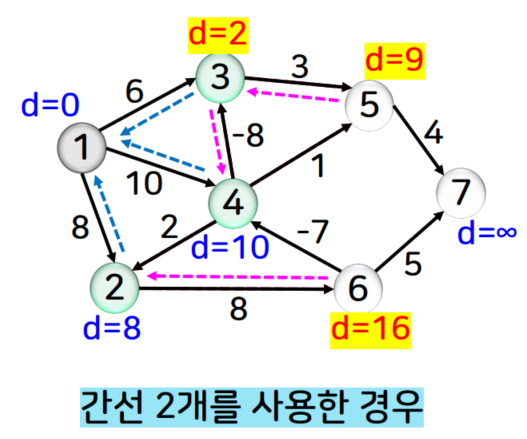 간선 3개를 사용한 최단경로는 1-2-3-4의 거리를 구합니다. → d[4] = 4-3+1 = 2