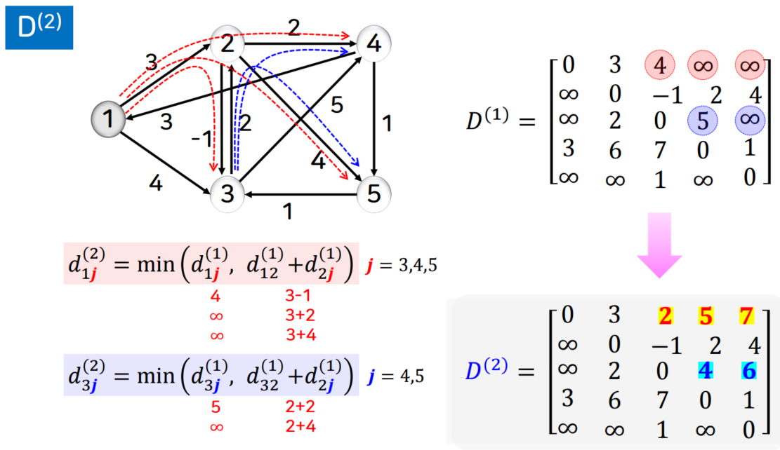 간선 2개를 사용한 최단경로는 1-2-3 과 1-3-4이므로 각각의 거리를 구합니다. → d[3] = 4-3=1, d[4] = 2+1=3