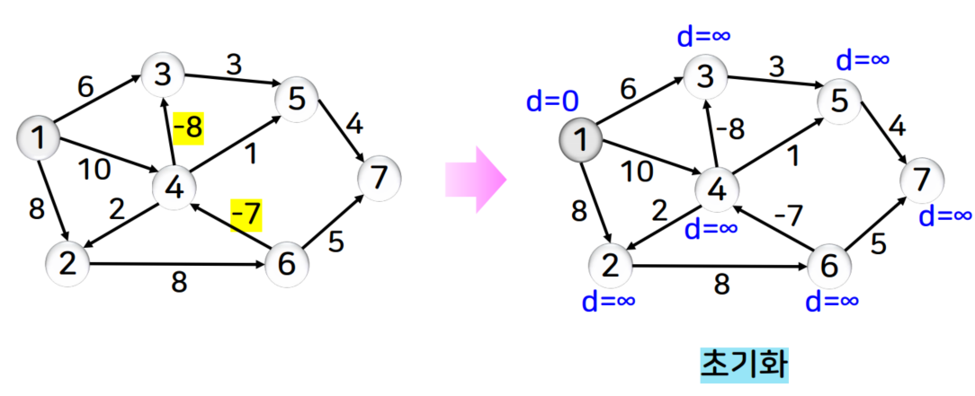 처음 초기화는 출발점 s의 거리 d[s] = 0, 나머지 정점 v의 거리 d[v] = ∞로 합니다.