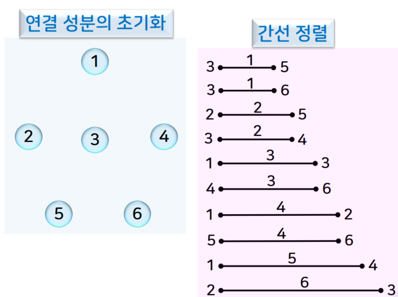첫번째로 연결 성분을 초기화하고 두번째로 가중치가 낮은 것부터 높은 순으로 간선을 정렬합니다.