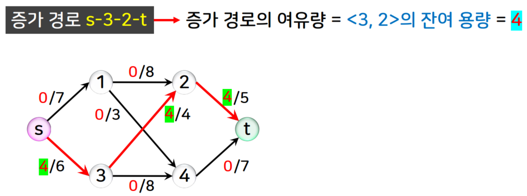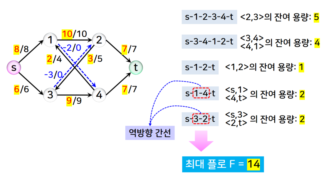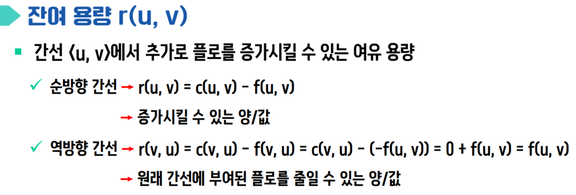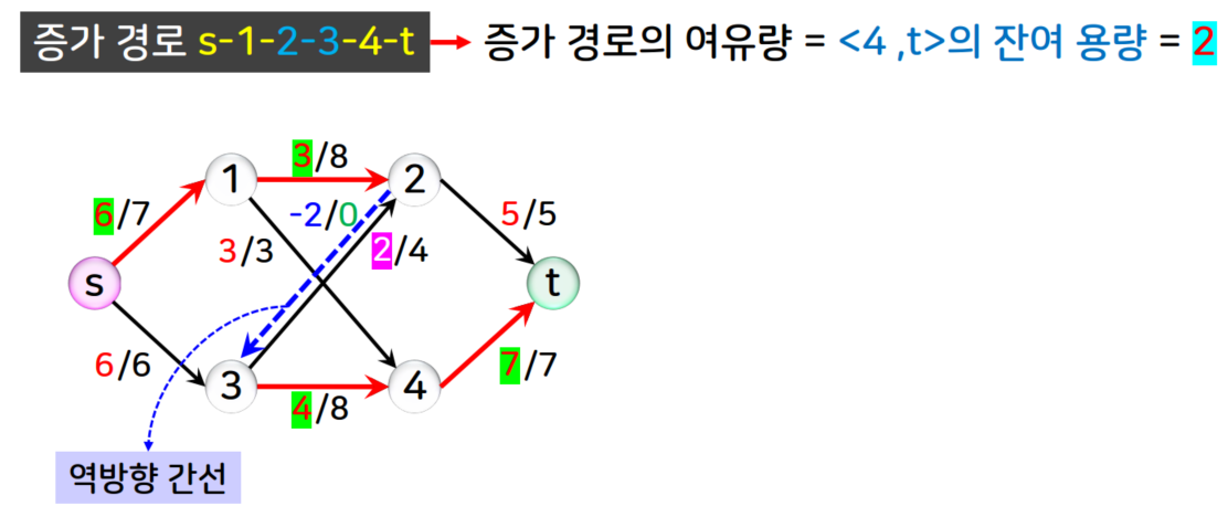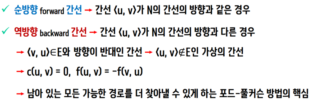 이 때 증가경로란 소스에서 싱크까지 더 많은 플로를 보낼 수 있는 경로를 의미합니다. 그런데 이 증가경로상의 간선이 네트워크 N의 간선방향과 일치하지 않을 수 있습니다.