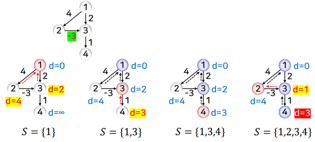 이 때 마지막 그림을 살펴보면 결과로는 d[3] = 3이 나옵니다. 그런데 만약 d[3] = 1이고 3-4는 1이므로 d[4] = 2가 되어야합니다. 이렇게 결과가 왜곡되는 문제가 발생할 수 있습니다.