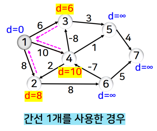 간선 1개를 사용한 최단경로는 1-2와 1-3이므로 두 정점 까지의 거리를 구합니다. → d[2] = 4, d[3] = 2