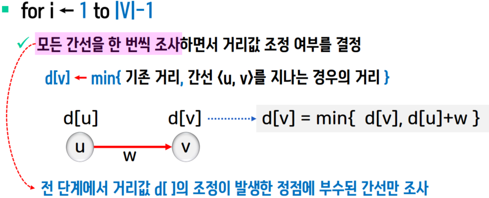 for ( 모든 간선 (u, v) ∈ E ) // O(|E|)