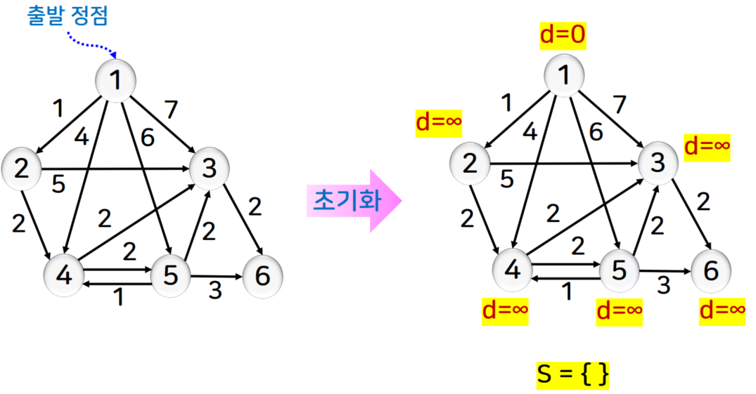 출발정점의 거리를 0으로 만들고 나머지 정점을 무한대로 만듭니다. 그리고 선택된 집합S를 공집합으로 만듭니다.