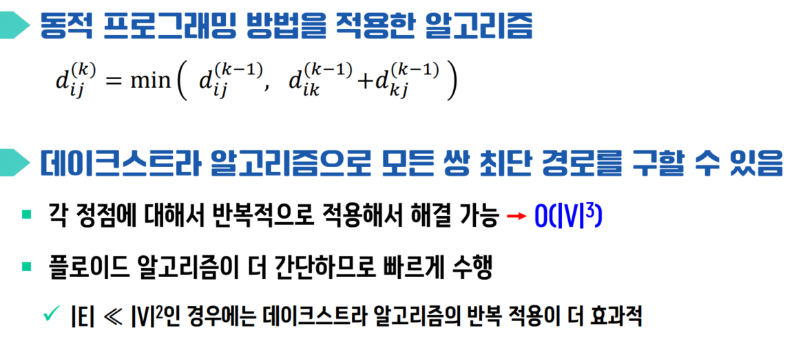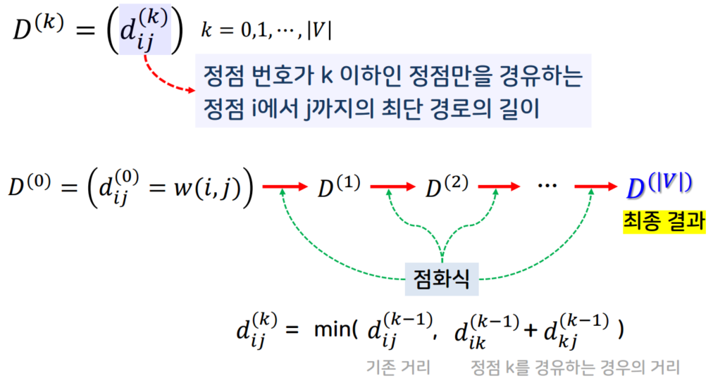 수행방식은 경유할 수 잇는 정점의 범위가 1인 경로부터 시작해서 |V|인 경로까지 하나씩 정점의 범위를 늘려가면서 모든 정점 간의 최단 경로를 한꺼번에 구합니다.