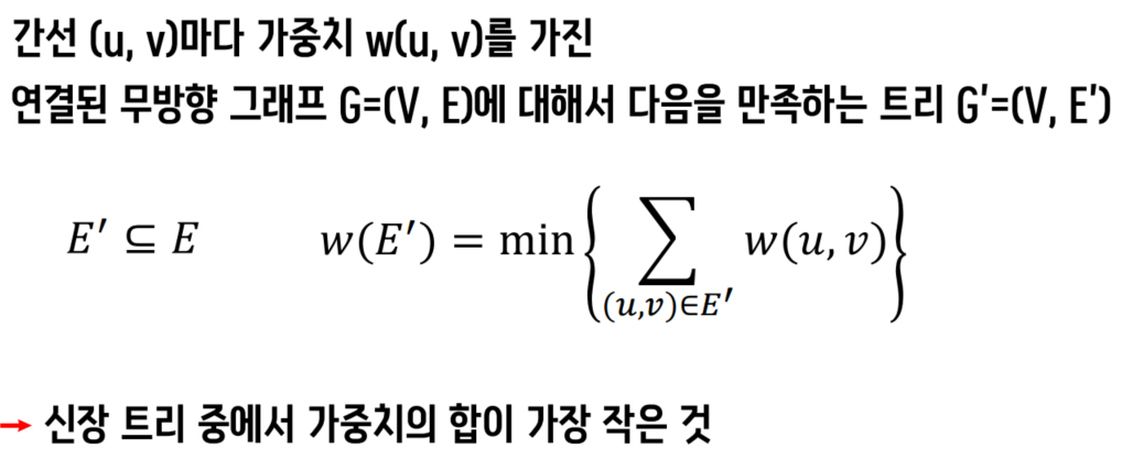 이 중 최소(비용) 신장 트리는 아래와 같은 정의를 만족하는 트리입니다.