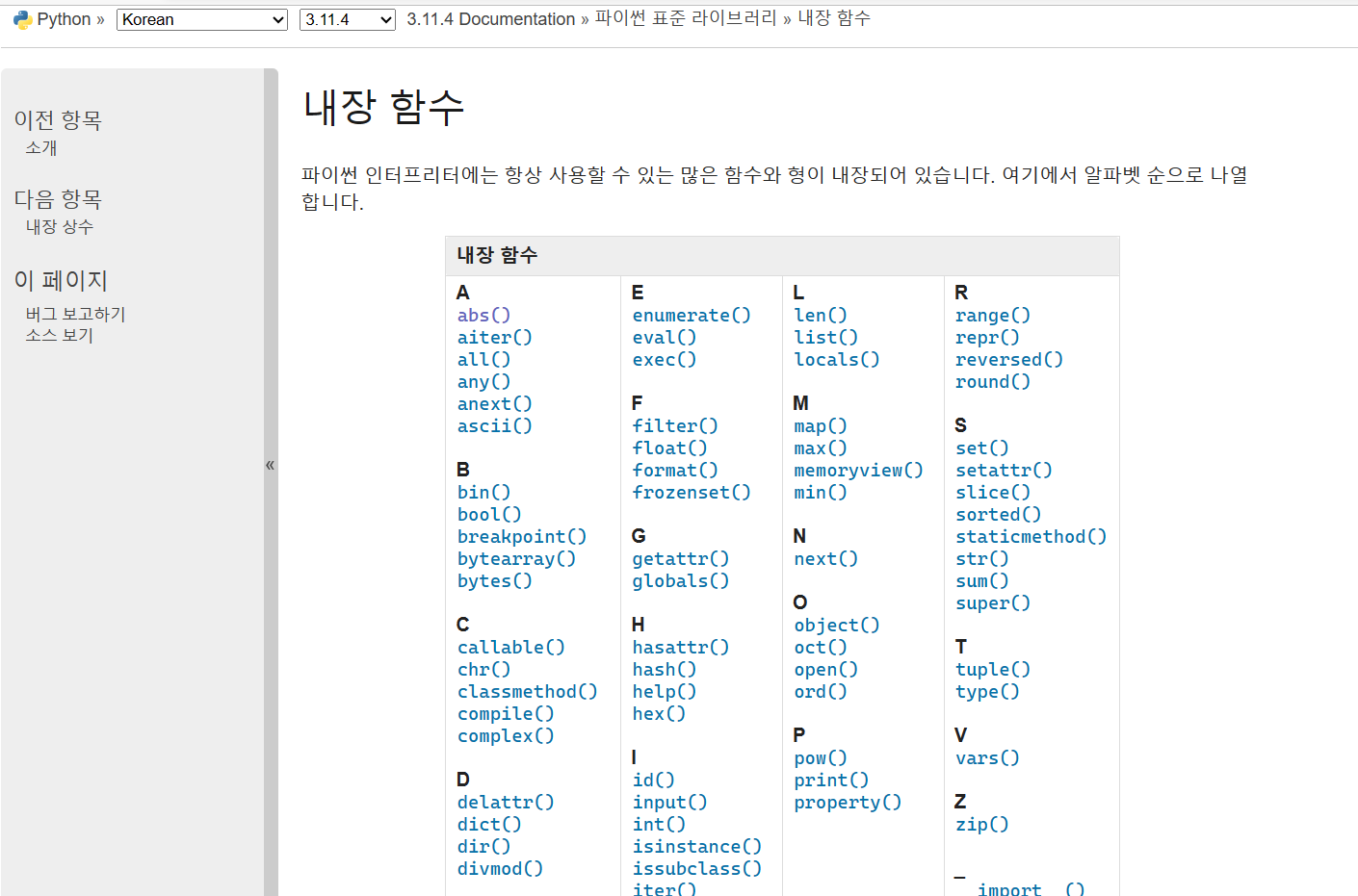 파이썬의 내장함수는 아래 사이트에서 찾을 수 있습니다.