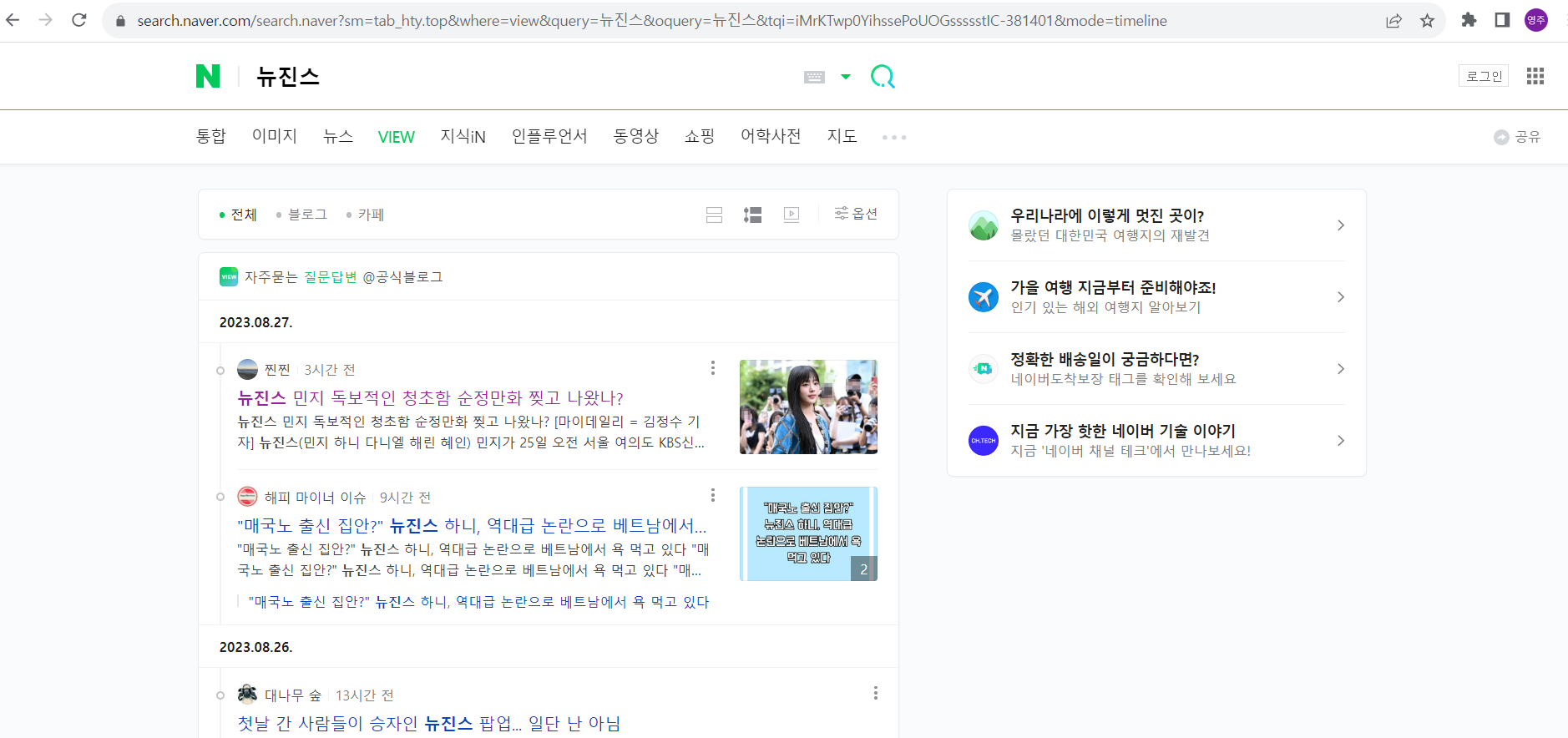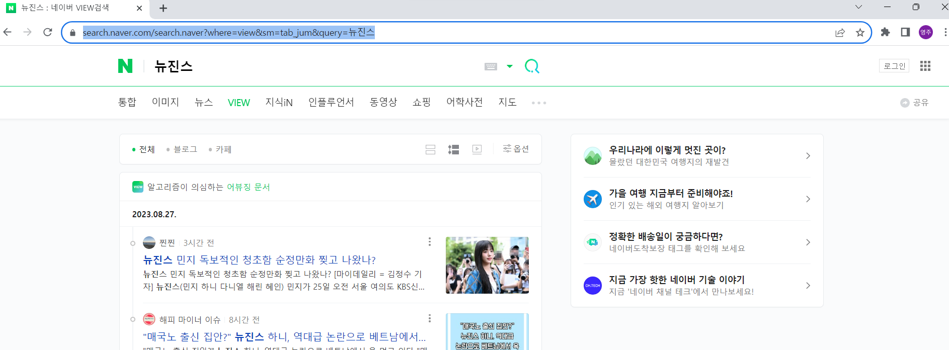 먼저 네이버에서 검색을 합니다 저는 뉴진스를 검색했습니다.