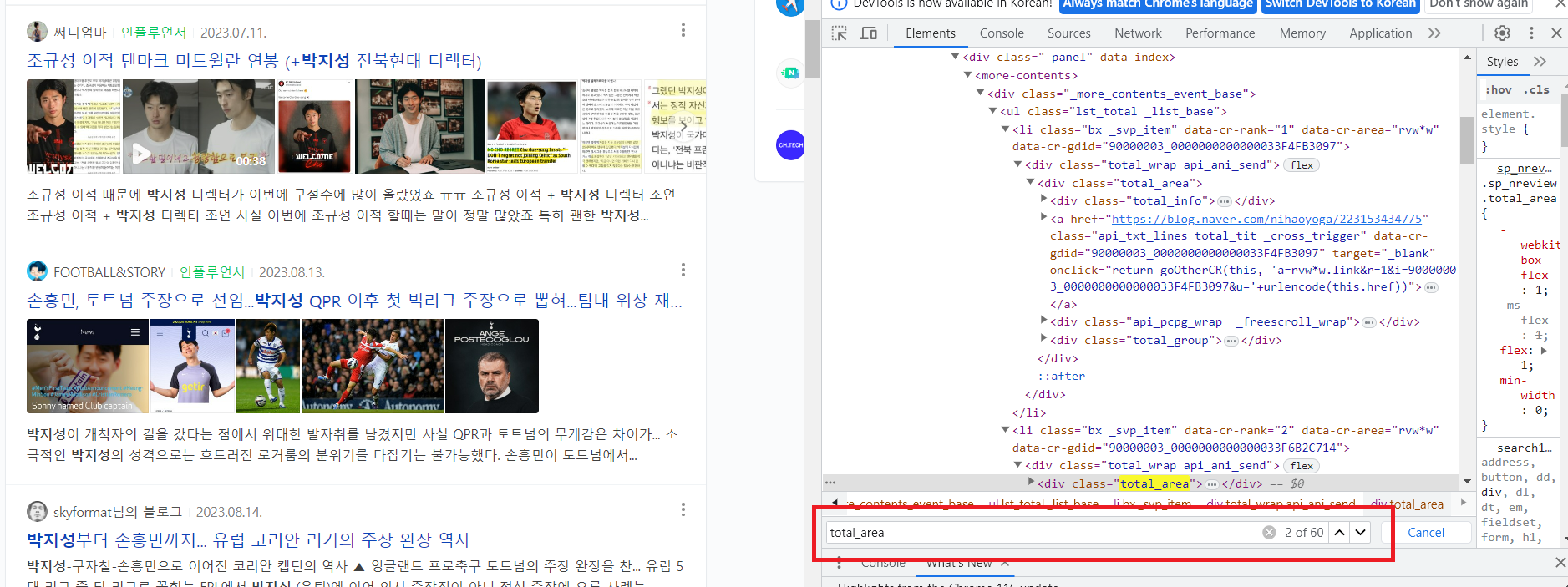 이번에는 박지성을 검색하여 개발자 도구를 열어보겠습니다